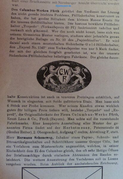 Scansione di una pubblicità Columbus-Werke datata 1913. Pubblicazione su: Der Papierhändler - Fachblatt Schreibwaren für Papier u. Büro-Bedarf. Contributo di Tom Westerich, https://www.penboard.de. Data ottenuta da quella di pubblicazione del volume da cui la pagina è estratta. Pubblicità della Columbus-Werke rivolta ai rivenditori, cita i modelli Express Nr. 1543 di fascia intermedia e la economica Torpedo Nr. 58P. Cita l'azienda come "Columbus-Werke Fürth Ernst Lenz & Co.", Fürth.
