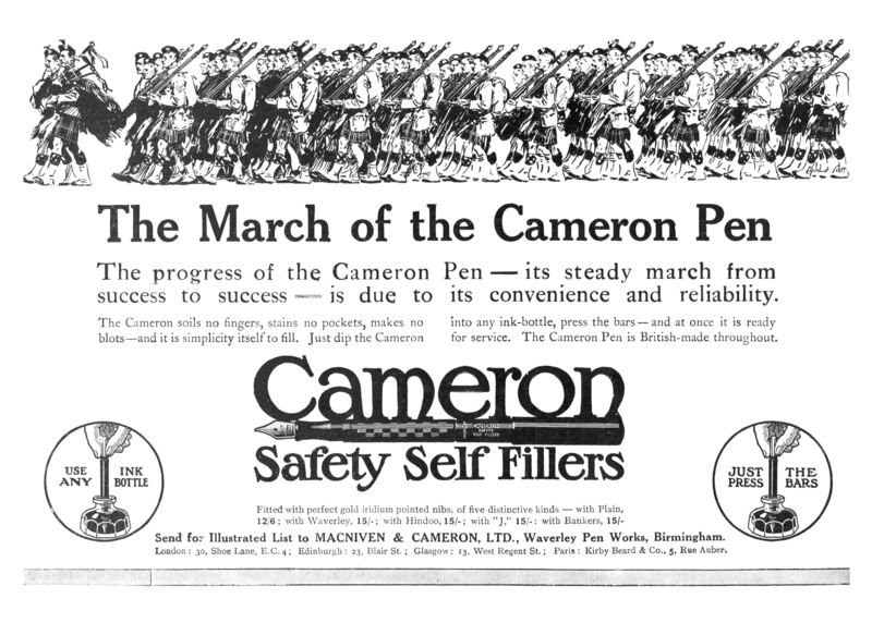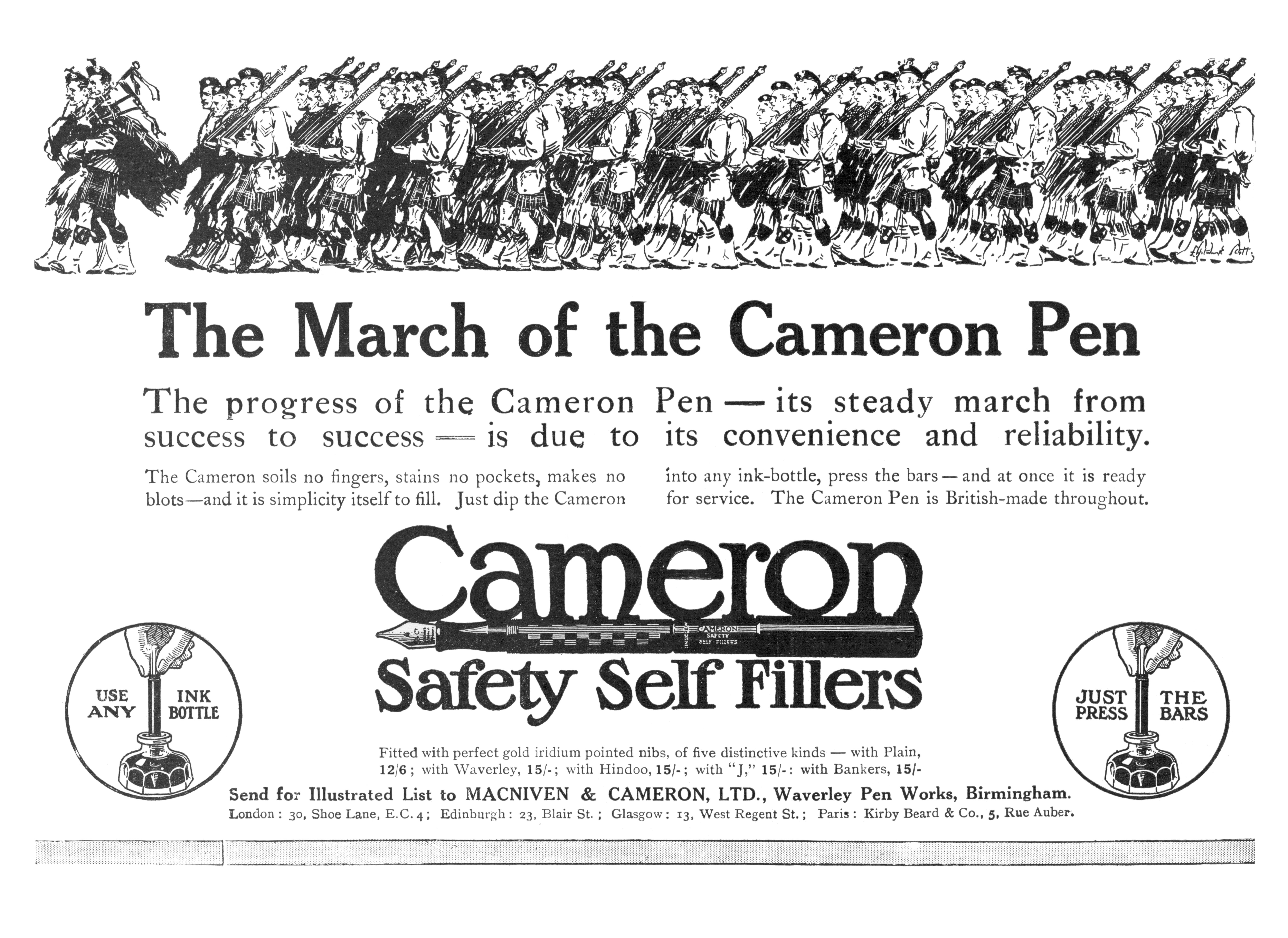 Scansione di una pubblicità Cameron datata 1917. Ritoccata dall'autore per una migliore nitidezza. Data indicativa, per l'uso dello stesso disegno di un'altra pubblicità di quell'anno. Pubblicizza il modello Cameron Safety Self Filler.