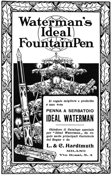 Scansione di una pubblicità Waterman datata 1911. Ritoccata dall'autore per una migliore nitidezza. Contributo di Armando Dabbene (utente forum fountainpen.it A Dabbene). Data indicata dal fornitore. Pubblicizza una 412 con decorazione filigree. Analoga a questa variante.