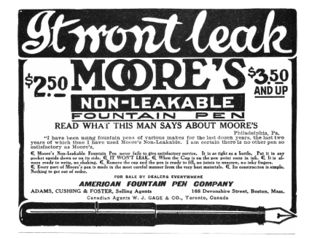 Scansione di una pubblicità Moore datata 1919. Ritoccata dall'autore per una migliore nitidezza. Data indicata dal fornitore. Pubblicizza un modello Non-Leakable.