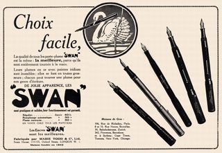 Scansione di una pubblicità Swan datata 1924. Indica come indirizzo: "133 & 135, Oxford Street, London". Ritoccata dall'autore per una migliore nitidezza. Data indicata dal fornitore. Pubblicizza i vari modelli di quel periodo nei diversi sistemi di caricamento (''Régulier", "Remplissage automatique", "Plume Rentrante"), marchiati Swan Safety Pen 2C, Swan Safety Propelling Pen, Self Filling Swan Pen (nelle varianti Swan SF 2 e Swan SF 1).