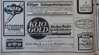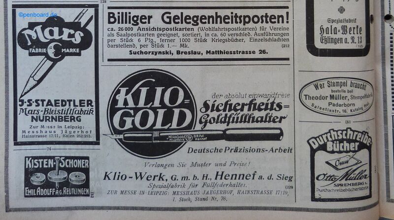 Scansione di una pubblicità datata 1922. Pubblicazione su: Der Papierhändler - Fachblatt Schreibwaren für Papier u. Büro-Bedarf. Contributo di Tom Westerich, https://www.penboard.de. Data ottenuta da quella di pubblicazione del volume da cui la pagina è estratta. Pagina di pubblicità varie per articoli di cancelleria (fra cui le matite Mars della Staedtler) con un riquadro concernente penne stilografiche, una pubblicità Klio-Werk per il modello Klio Gold.