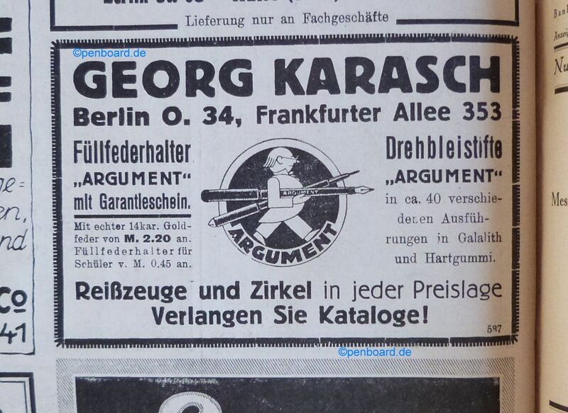 Scansione di una pubblicità Argument datata 1925. Pubblicazione su: Der Papierhändler - Fachblatt Schreibwaren für Papier u. Büro-Bedarf. Indica come indirizzo: "Berlin O. 34, Frankfurter Allee 353". Contributo di Tom Westerich, https://www.penboard.de. Data ottenuta da quella di pubblicazione del volume da cui la pagina è estratta. Pubblicità di stilografica e matita meccanica. Cita la ditta come "Georg Karash".