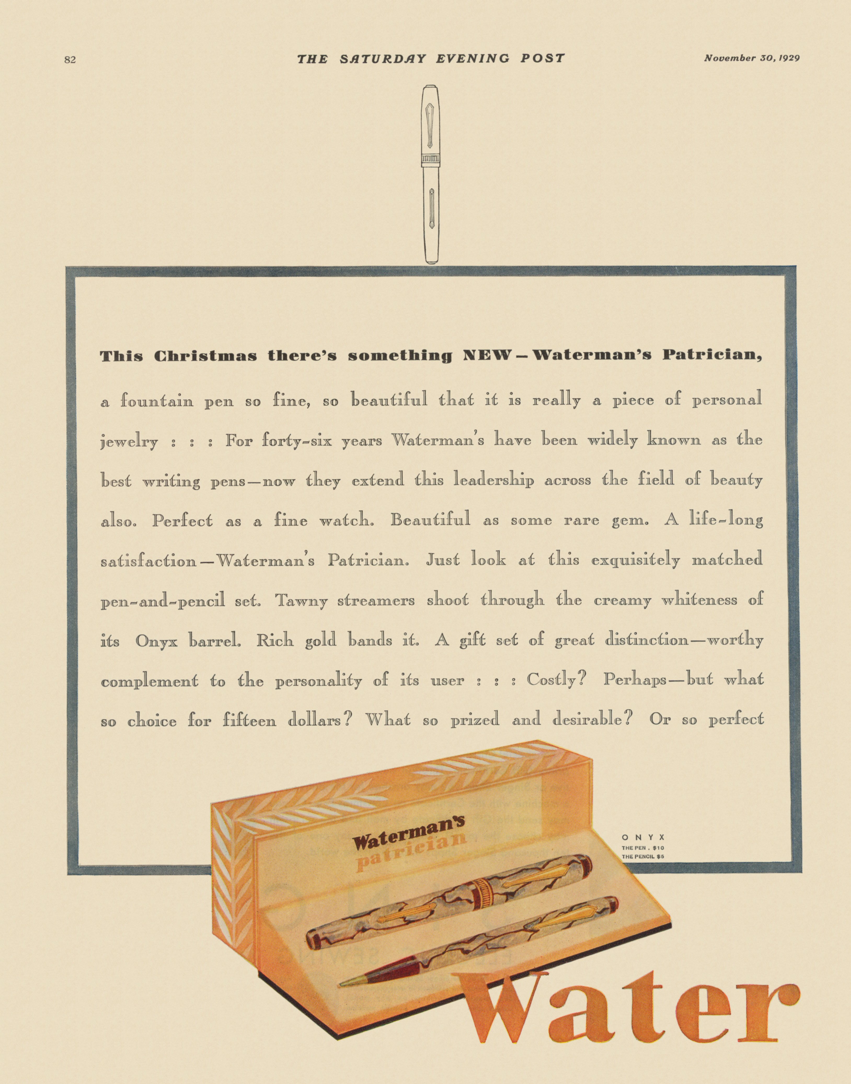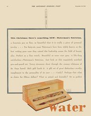 Scansione di una pubblicità Waterman datata 1929-11-30. Pubblicazione su: The Saturday Evening Post. Ritoccata dall'autore per una migliore nitidezza. Data visibile direttamente. Pubblicizza il nuovo modello Patrician. Pagina sinistra.