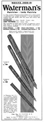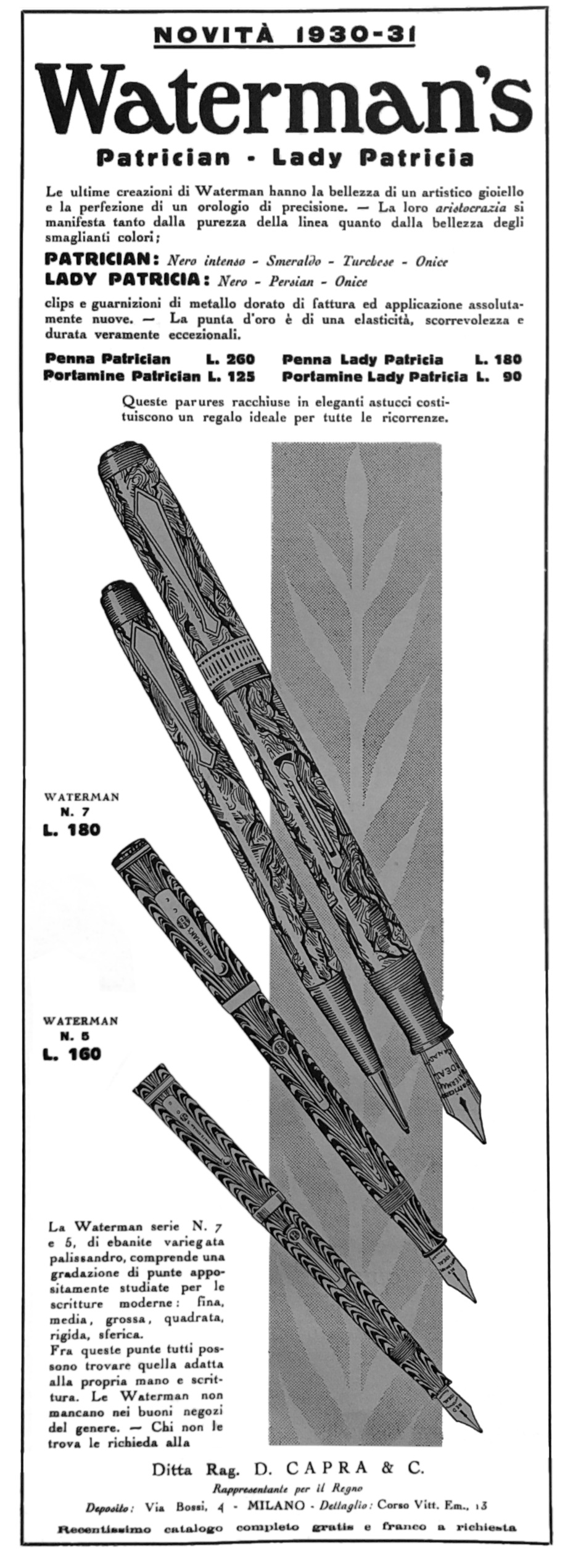 Scanning of advertising from Waterman dated 1930-12-07. Published on: L'Illustrazione Italiana, year LVII, n. 49. Retouched by the author for a better sharpness. Dating established by finding the page in an archived version of the magazine. Published also on N. 52 (1930-12-28). Advertising for the Patrician, Ripple No. 7 and Ripple No. 5 models.