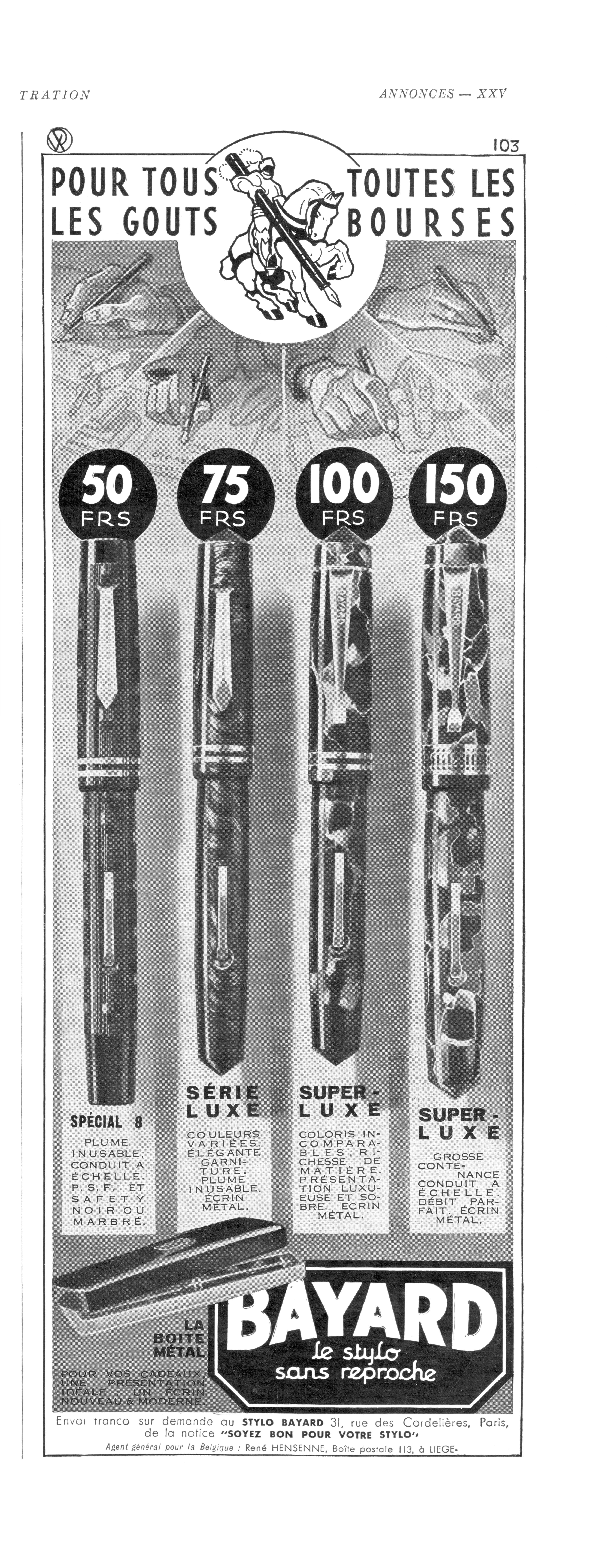 Scansione di una pubblicità Bayard datata 1933-12-22. Pubblicazione su: L'Illustration, n. 4738. Indica come indirizzo: "31, rue des Cordelières, Paris". Ritoccata dall'autore per una migliore nitidezza. Data indicata dal fornitore, affidabile. Pubblicizza i modelli Special 8, Luxe e Superluxe, quest'ultima anche nella variante più grande denominata "Grosse Contenance".