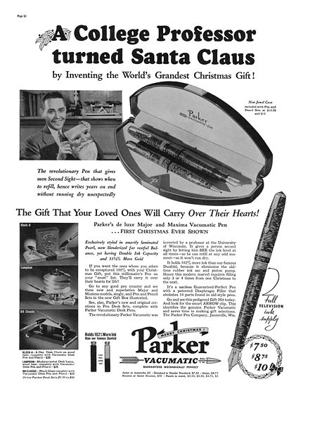 <multilang> @it|Scansione di una pubblicità Parker dell'8 Novembre 1937 per il modello Vacumatic. Pubblicata su Life Magazine. Data sul retro del foglio. @en|Scanning of a November, 8 1937 Parker advertising for the Vacumatic model. Published on Life Magazine. Date on the back. </multilang>