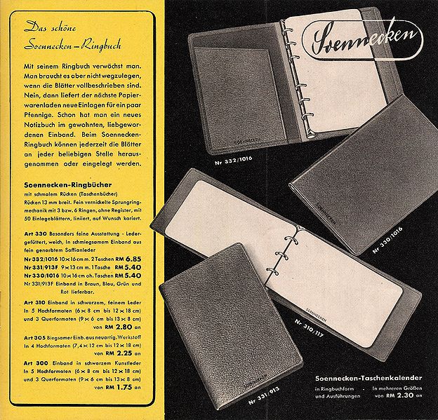 Scanning of a catalog page from Soennecken dated 1937. Dating given by provider, reliable. Seventh page. Advertising for some organizers.