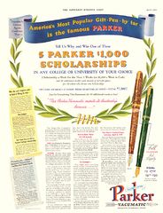 Scanning of advertising from Parker dated 1939-04-01. Published on: The Saturday Evening Post. Retouched by the author for a better sharpness. Date directly visible. Advertising for the Vacumatic model (showing the Major size) and the economy Shadow Wave version for its transparent barrel called Full Television Ink Supply. Report the terms of a prize contest for scholarships.