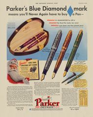 Scanning of advertising from Parker dated 1939-11-11. Published on: The Saturday Evening Post. Retouched by the author for a better sharpness. Date directly visible. Advertising for the Vacumatic model, the version Maxima, Major and Junior (in the Shadow Wave variant) mentioning also Slander Maxima, Debutante and Sub-deb sizes. Explaining the "Blue diamond" life warranty, the vacumatic filler called also "diaphragm filler" and the transparent barrel called "Full Television Ink Supply".