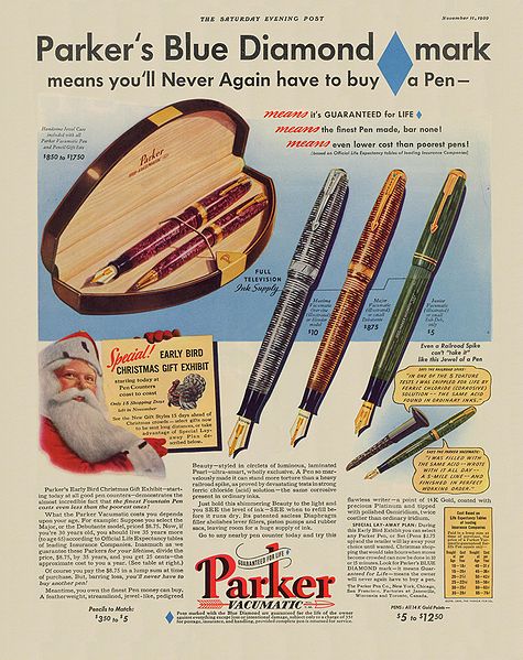 Scansione di una pubblicità Parker datata 1939-11-11. Pubblicazione su: The Saturday Evening Post. Ritoccata dall'autore per una migliore nitidezza. Data visibile direttamente. Pubblicizza il modello Vacumatic nelle tre varianti, Maxima, Major e Junior (nella variante denominata Shadow Wave) citando anche le misure Slander Maxima, Debutante e Sub-deb. Illustra in particolare la nuova garanzia a vita con il "Blue diamond", il caricamento chiamato "diaphragm filler" e il fusto trasparente, chiamato "Full Television Ink Supply".