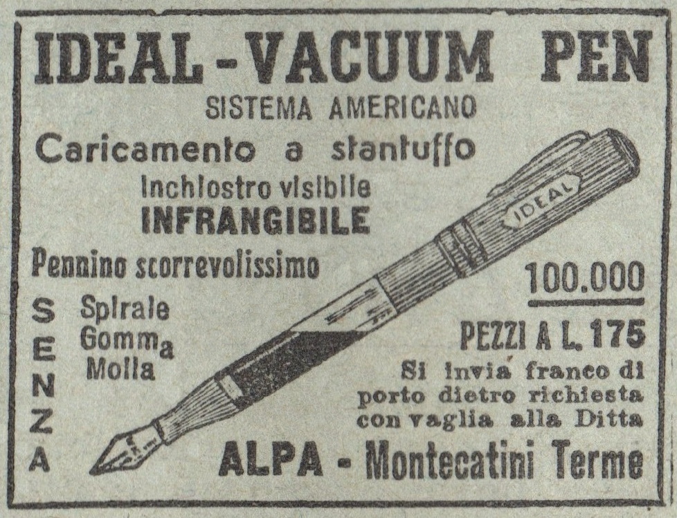 Scansione di una pubblicità Alpa datata 1946-04-28. Pubblicazione su: La Domenica del Corriere, anno 48, n. 5, pag. IV copertina. Contributo di Giorgio (utente forum Musicus). Data ottenuta da quella di pubblicazione del volume da cui la pagina è estratta. Pubblicizza il modello Ideal-Vacuum Pen.