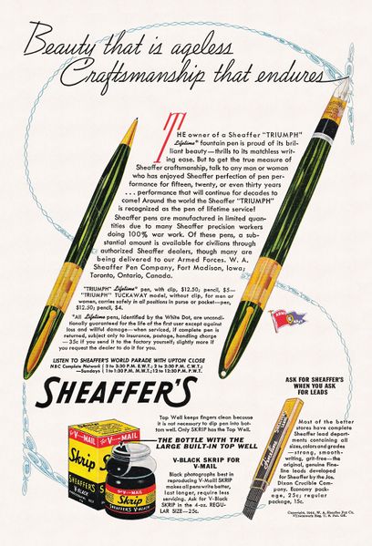 Scansione di una pubblicità Sheaffer datata 1944. Ritoccata dall'autore per una migliore nitidezza. Data dalla nota di copyright. Pubblicizza un set penna/matita modello Triumph Lifetime e menziona la boccetta Skrip-Well chiamata in questo caso Top Well, il modello Tuckaway Lifetime, la garanzia Lifetime identificata dal White dot, e la variante di inchiostro Skrip specifica per le V-Mail.