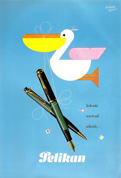 Scansione di una pubblicità Pelikan datata 1952. Realizzata da: Herbert Leupin. Ritoccata dall'autore per una migliore nitidezza. Data riportata sul retro del foglio. Mese confermato dal margine sul retro. Pubblicizza il modello Pelikan 400.