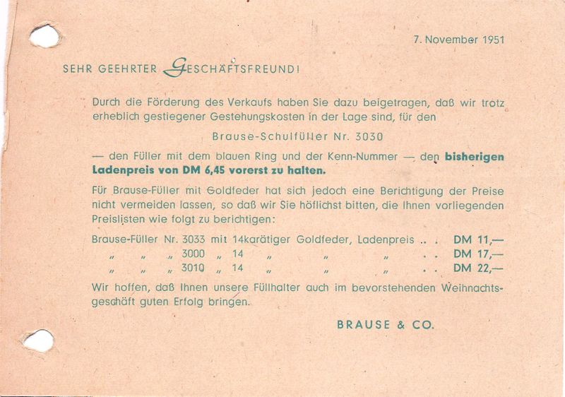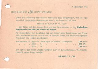 Scansione di una cartolina Brause datata 1951-11-07. Data visibile direttamente. Retro. Riporta i prezzi dei modelli 3030 (scolastico) e 3033, 3000 e 3010. Sull'altro lato di File:1951-Brause-Postcard-Front.jpg.