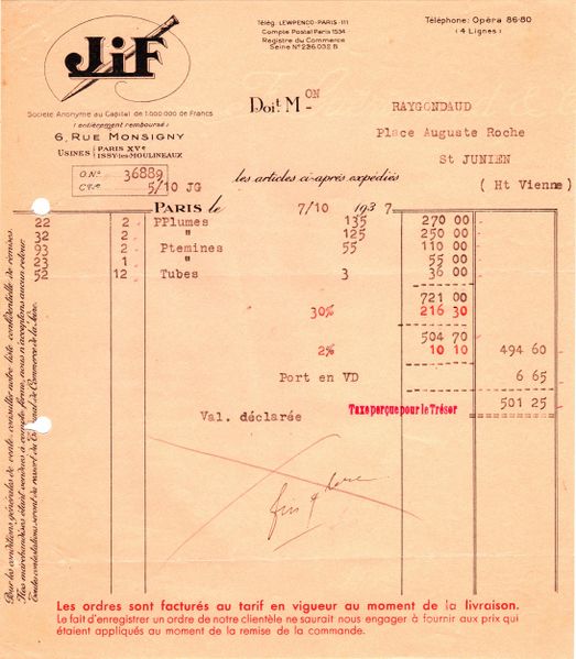 Scanning of a bill from JiF dated 1937-03-12. Date directly visible. It was French Waterman agent. Refers to not clearly identified pencil, materials and fountain pens (Waterman 32?, Waterman 22??). Mention as address: "Rue Monsigny, 6 - Paris". Retouched by the author for a better sharpness.
