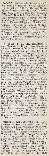 Scansione di una rubrica del 1914. Tratta da: "Whitaker's Red Book of Commerce - Who's Who in Business" (pag. 676), edito da "J. Whitaker and Sons, Ltd.". Concerne le aziende: Mitchell. Riporta la voce sulla "Mitchell, Williams (Pens) Ltd.", fondata nel 1830 circa, incorporata nel 1906, con sede Washington Works, Cumberland Street, Birmingham. Ripubblicato dal sito di Grace's Guide, originale a questo indirizzo.