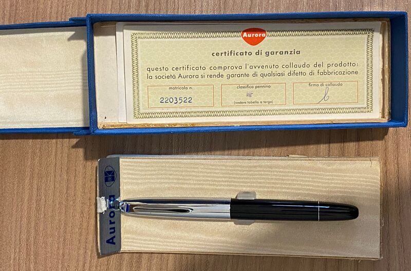 Foto di una penna Aurora. Modello: Aurora 88K. Caricamento a stantuffo. Versione con cappuccio cromato. Seriale 2203552. Contributo di Francesco (utente forum francoiacc).