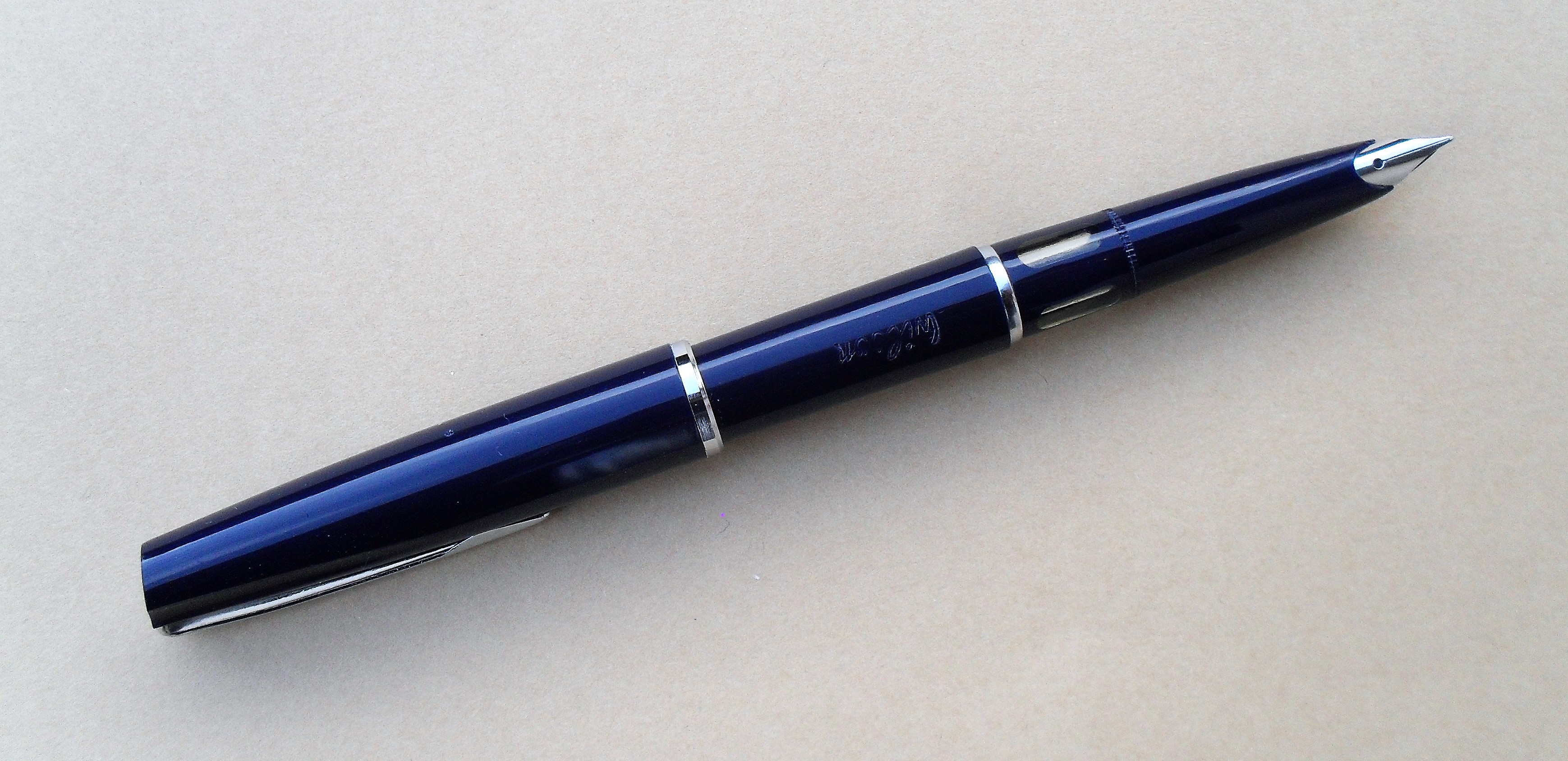 Foto di una penna Wilson. Caricamento a stantuffo. Realizzazione in resina plastica blu scuro. Modello ignoto, penna scolastica di buona fattura. Contributo di Alberto (utente forum A Casirati).