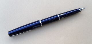 Photo of a pen produced by Wilson. Filling system: piston filler. In dark blue plastic resin. Unknown model, well-made school pen.