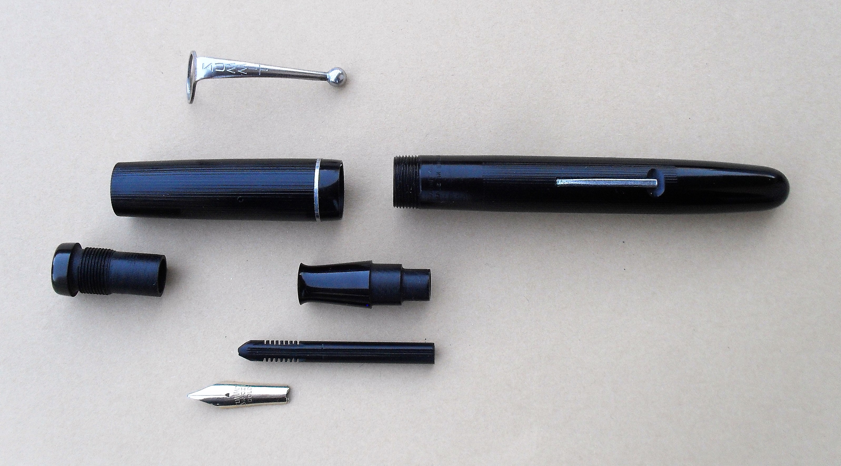 Foto di una penna Summit (un marchio della Lang - Curzon - Summit). Modello: Summit Cadet. Caricamento a levetta. Realizzazione in celluloide nera cesellata. Modello economico S.100, produzione del dopoguerra, terza versione (1949 circa). Contributo di Alberto (utente forum A Casirati).