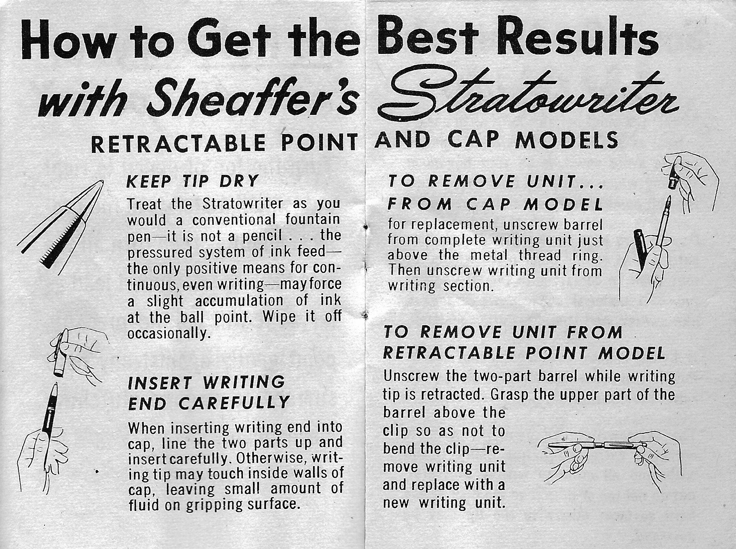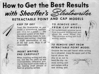 Scansione di un foglietto di istruzioni Sheaffer del 1947. Relativo ad un modello Triumph Pen. Data indicativa, dal codice riportato su una pagina (6-47) che potrebbe ragionevolmente indicare l'anno. Libretto istruzioni generico per i modelli dell'epoca. Pagine n. 5 e 6. Illustra il caricamento delle sfere Stratowriter. Ritoccata dall'autore per una migliore nitidezza. Da una confezione originale.