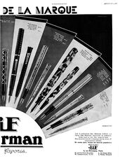 Scansione di una pubblicità Waterman datata 1930-11-22. Pubblicazione su: L'Illustration. Ritoccata dall'autore per una migliore nitidezza. Contributo di Giorgio (utente forum Musicus). Data riportata sul retro del foglio. Pubblicizza diversi modelli: 542½V (con rivestimento "Décor L"), 652, 1152 (con rivestimento "Décor D"), Patrician (in "nacre"), 4452V o 5552V (con rivestimento "Décor CA"), 442½V (con rivestimento "Décor O") e delle matite meccaniche JiF.