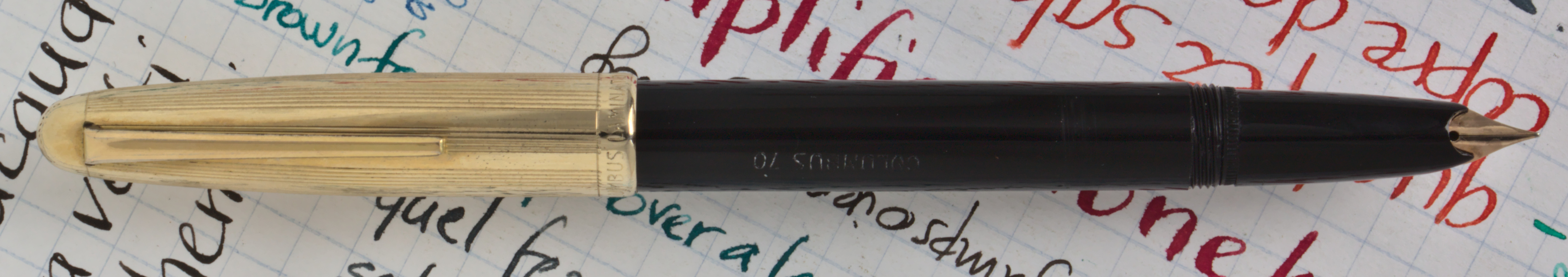 Photo of a pen produced by Columbus. Model: Columbus 70. Filling system: piston filler. In black plastic resin. Streamlined model with rolled gold cap.