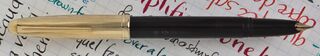 Foto di una penna Columbus. Modello: Columbus 70. Caricamento a stantuffo. Realizzazione in resina plastica nera. Modello affusolato con cappuccio laminato.