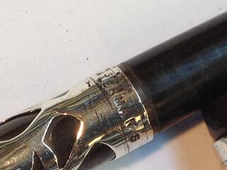 Foto di una penna Waterman. Modello: Waterman 12. Caricamento a contagocce. Realizzazione con rivestimento in argento traforato. Dettaglio della stampigliatura. Con un raro pennino con stampigliatura a stella. Contributo di Armando Dabbene (utente forum fountainpen.it A Dabbene).