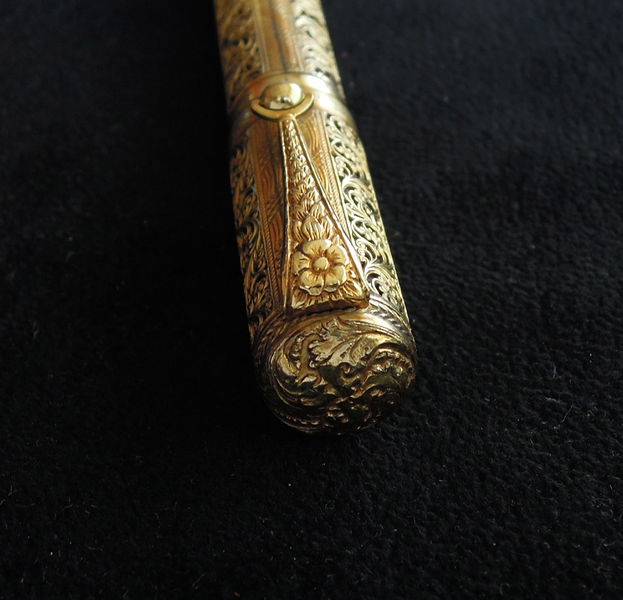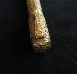 Photo of a pen produced by Europa. Filling system: safety. With filigree gold rolled overlay.
