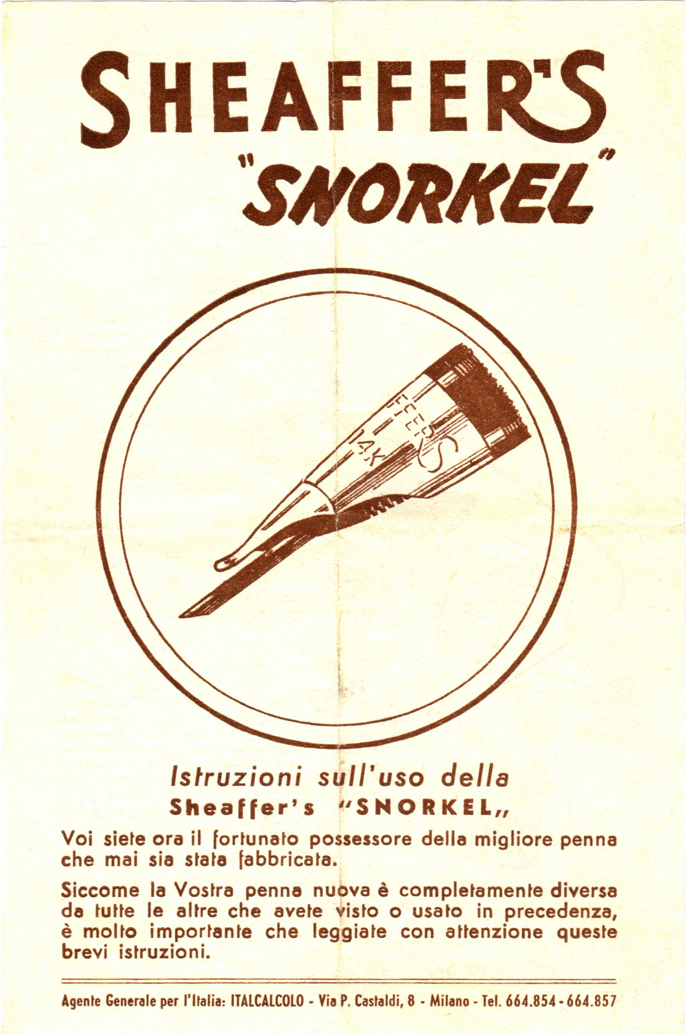 Scansione di un foglietto di istruzioni Sheaffer del 1957. Relativo ad un modello Snorkel Pen. Data indicativa, dal codice riportato su un lato (S-057) che potrebbe indicare l'anno. Fronte. Sull'altro lato di File:1957-Sheaffer-Snorkel-Verso.jpg.
