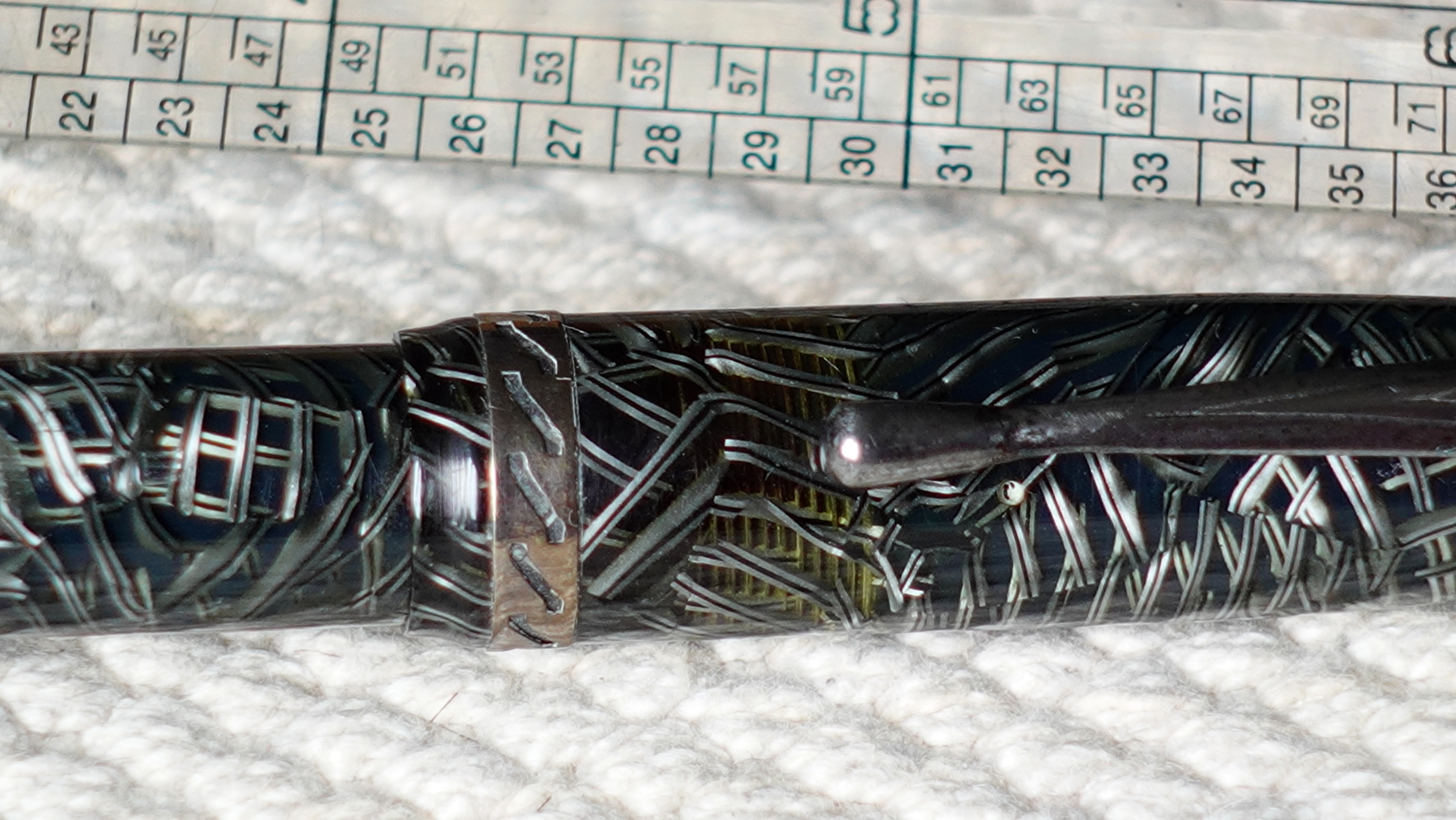 Photo of a pen produced by Astura (sub-band of Società Anonima Fabbrica Italiana Stilografiche). Model: Astura Traparente. Filling system: button filler. In pine needles grey celluloid. Detail of band. Version with drop clip and openwork band.