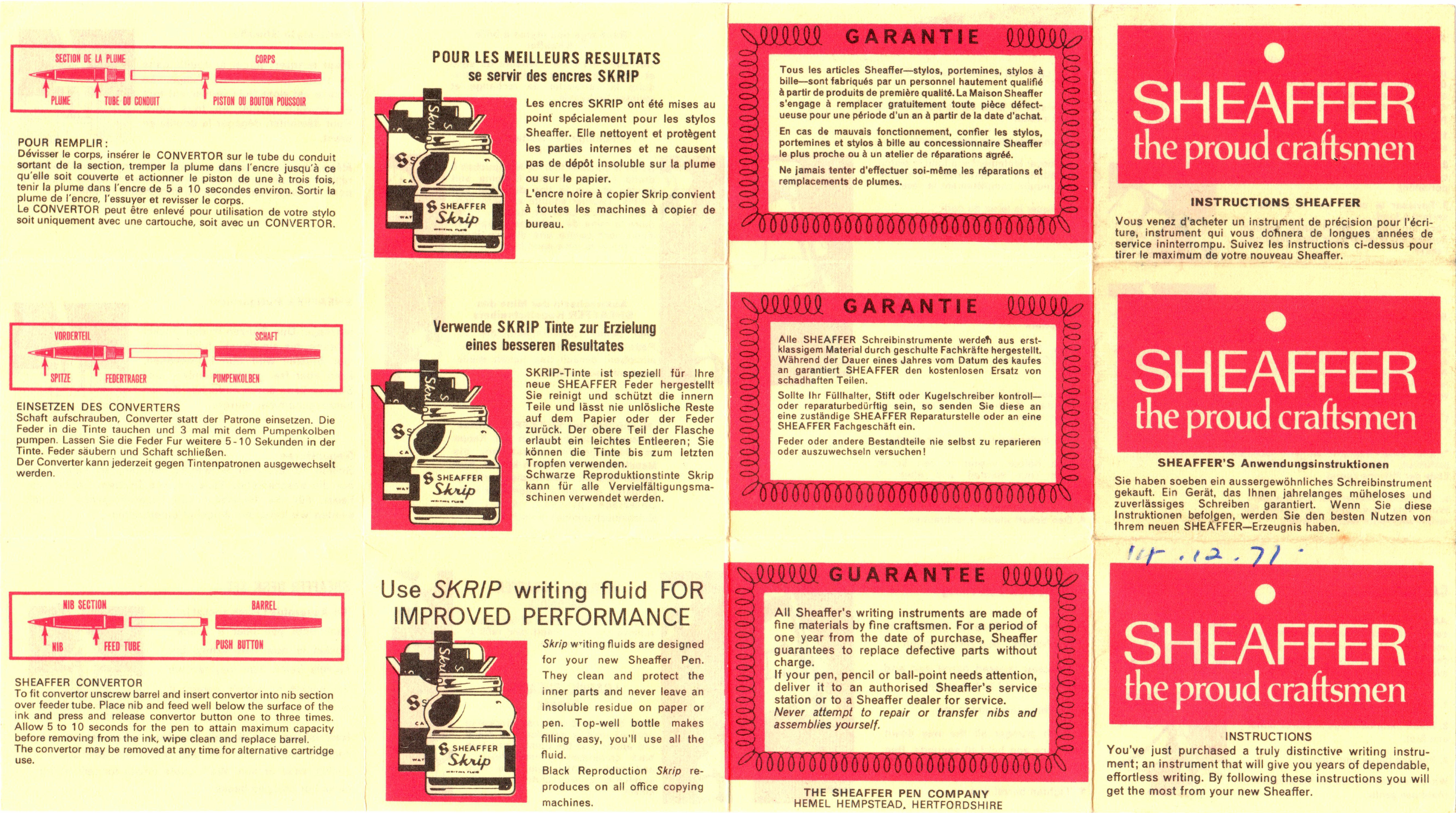Scansione di un foglietto di istruzioni Sheaffer del 1971-12-14. Parte della piegatura esterna. Istruzioni per il converter, promozione per l'inchiostro Skrip e garanzia. Sull'altro lato di File:1971-Sheaffer-Multiple-Instro-Int.jpg. Contributo di David Parisi (utente forum pencilator).
