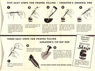 Scansione di un foglietto di istruzioni Sheaffer degli anni '50. Relativo ad un modello Snorkel Pen. Data indicativa, dal codice riportato su un lato (1-54) che potrebbe ragionevolmente indicare l'anno. Lato interno, con le istruzioni per i caricamenti Snorkel e TIPdip. Sull'altro lato di File:1954-Sheaffer-Snorkel-TipDip-Ext.jpg. Contributo di David Parisi (utente forum pencilator). Da una confezione originale.