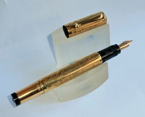 Photo of a pen produced by Vulcan. Filling system: safety. With abstract pattern panels gold rolled overlay. Unknown model.