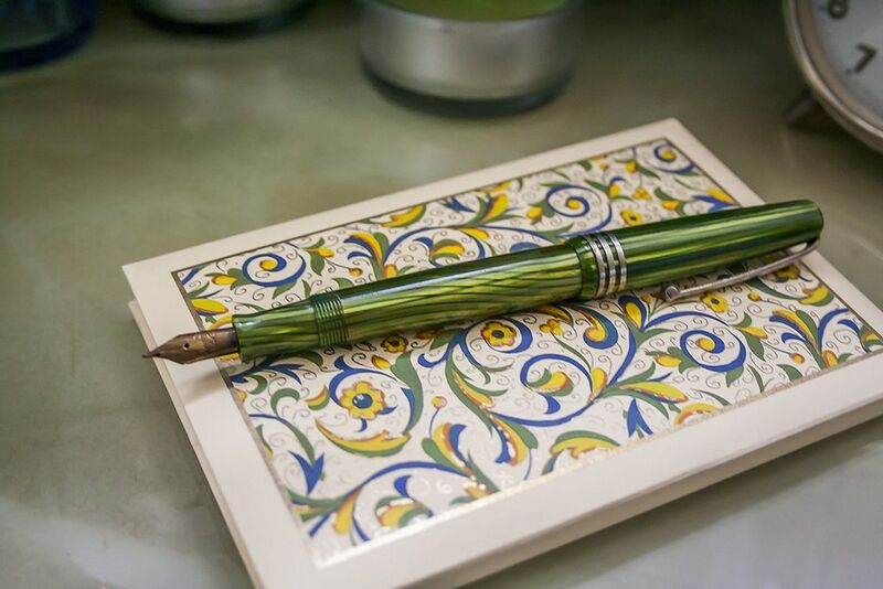 Foto di una penna Vulcan. Caricamento a pulsante di fondo. Realizzazione in calluloide a righe verdi. Modello ignoto. Contributo di muristenes (utente forum muristenes).