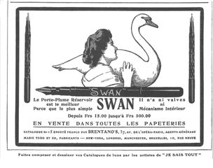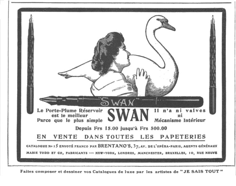 Scansione di una pubblicità Swan datata 1902. Pubblicazione su: Je sais tous. Rappresentante: "Brentano's". Indica come indirizzo: "37, Av. de l'Opéra, Paris". Ritoccata dall'autore per una migliore nitidezza. Contributo di Armando Dabbene (utente forum fountainpen.it A Dabbene). Data indicata dal fornitore. Pubblicizza vari modelli Swan Pen con caricamento a contagocce, straight cap e alimentatore overfeed.