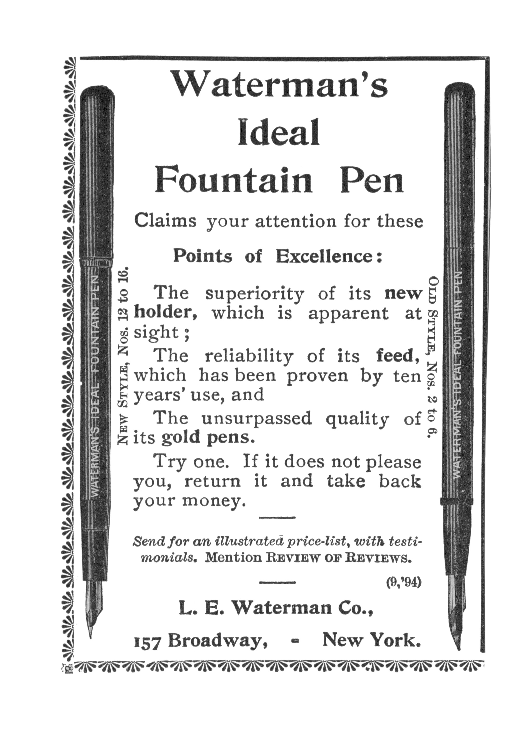 Scansione di una pubblicità Waterman datata 1894-09. Pubblicazione su: Review of Reviews. Riferimento all'azienda come: "L. E. Waterman Co.". Indica come indirizzo: "157 Broadway, New York". Ritoccata dall'autore per una migliore nitidezza. Data visibile direttamente. Sotto la richiesta di menzione per la rivista, nella forma (9,'94) che si trova pure in altre pubblicità. Pubblicizza alcuni dei primi modelli senza clip nella versione con cappuccio a frizione ordinario (nelle numerazioni da 12 a 16) e con cappuccio dritto straight cap nelle numerazioni da 2 a 6.