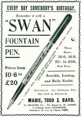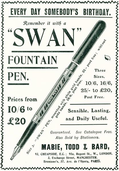 Scansione di una pubblicità Swan datata 1904. Riferimento all'azienda come: "Mabie, Todd & Bard". Indica come indirizzo: "93, Cheapside, London, EC". Data indicata dal fornitore. Pubblicizza una stilografica Swan Pen 4662 con straight cap. Ripubblicata dal sito http://www.historyworld.co.uk che mette a disposizione l'immagine all'indirizzo: http://www.historyworld.co.uk/advert.php?id=1428.