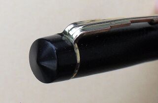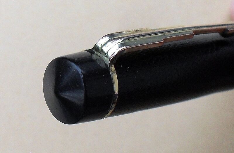 Foto di una penna Summit (un marchio della Lang - Curzon - Summit). Modello: Summit S.75. Caricamento a levetta. Realizzazione in celluloide nera cesellata. Dettaglio della testa del cappuccio. Prima versione (mk1), risalente all'inizio degli anni '30 (vedi la recensione). Contributo di Alberto (utente forum A Casirati).