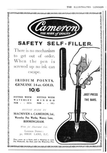 Scansione di una pubblicità Cameron datata 1916-10-28. Pubblicazione su: The Illustrated London News. Riferimento all'azienda come: "Macniven & Cameron Ltd.". Indica come indirizzo: "Waverley Pen Works, Watery Lane, Birmingham". Ritoccata dall'autore per una migliore nitidezza. Data riportata sul retro del foglio. Pubblicizza il modello Cameron Safety Self Filler.