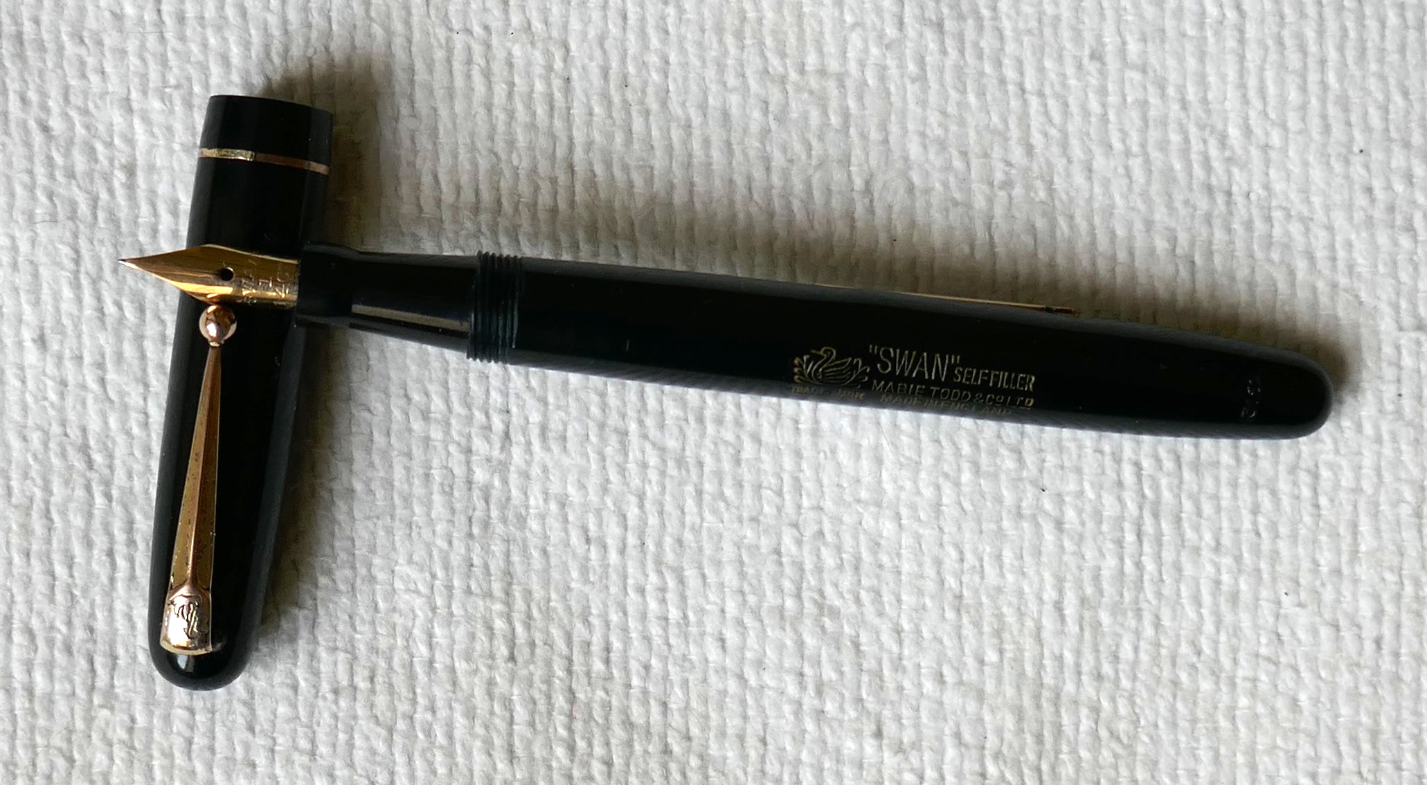 Foto di una penna Swan. Modello: Swan 3162. Caricamento a levetta. Realizzazione in celluloide nera. Dimensione piccola con veretta singola, pennino #1. Contributo di Andrea (utente forum bisguillo).