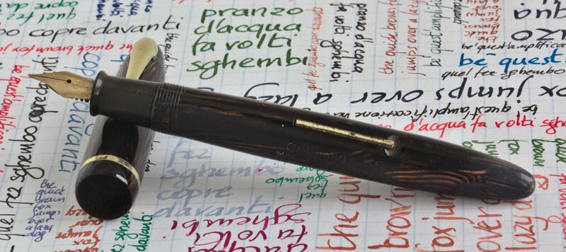 Foto di una penna Columbus. Modello: Columbus 55. Caricamento a levetta. Realizzazione in celluloide striata marrone.