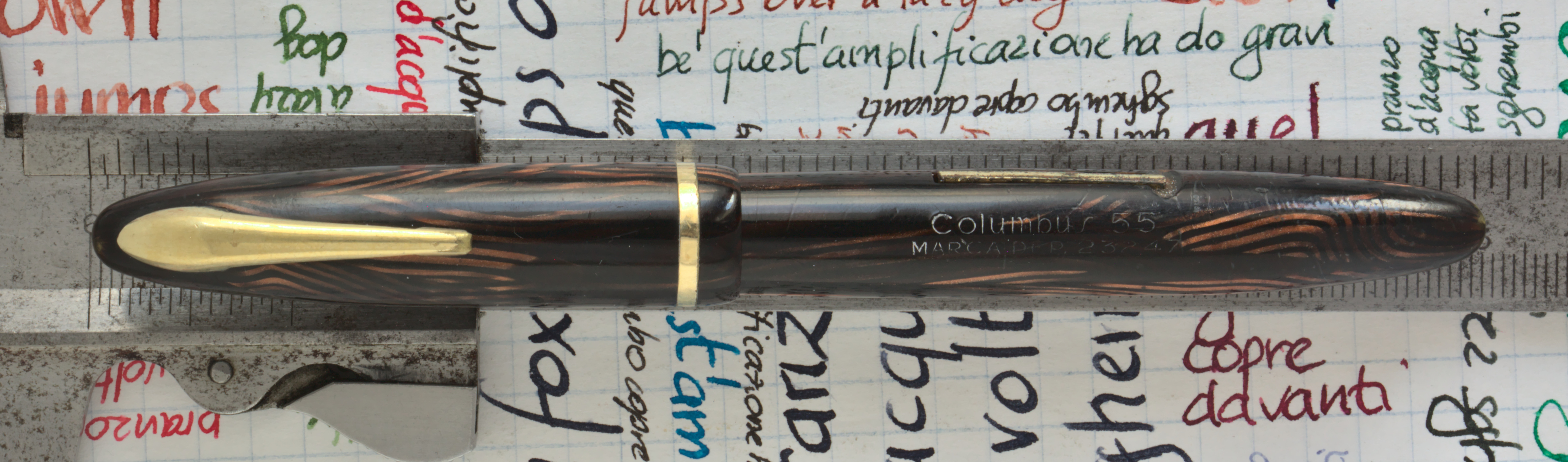 Foto di una penna Columbus. Modello: Columbus 55. Caricamento a levetta. Realizzazione in celluloide striata marrone.