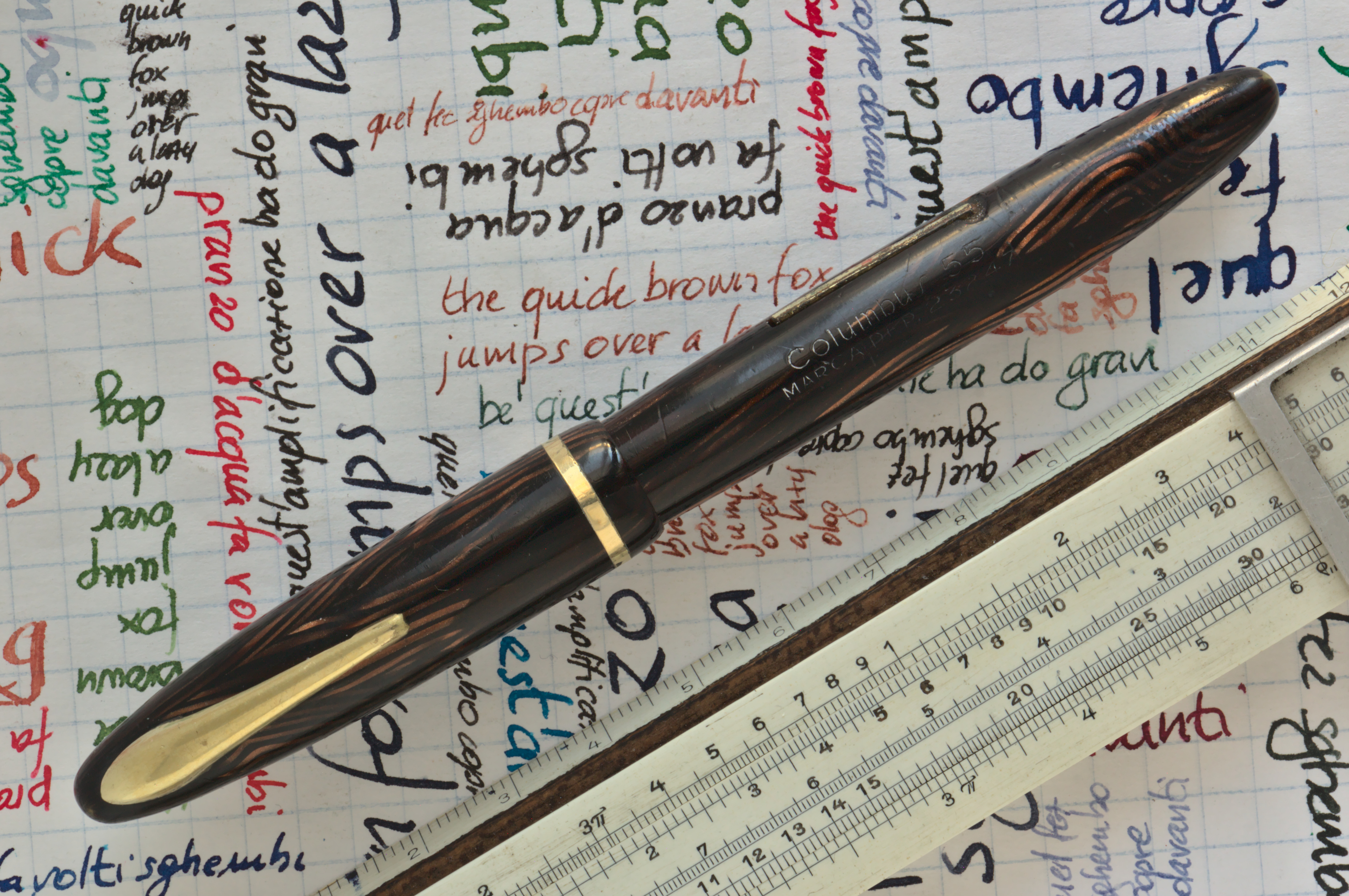 Photo of a pen produced by Columbus. Model: Columbus 55. Filling system: lever filler. In striated brown celluloid.