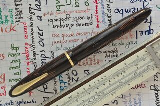 Foto di una penna Columbus. Modello: Columbus 55. Caricamento a levetta. Realizzazione in celluloide striata marrone.