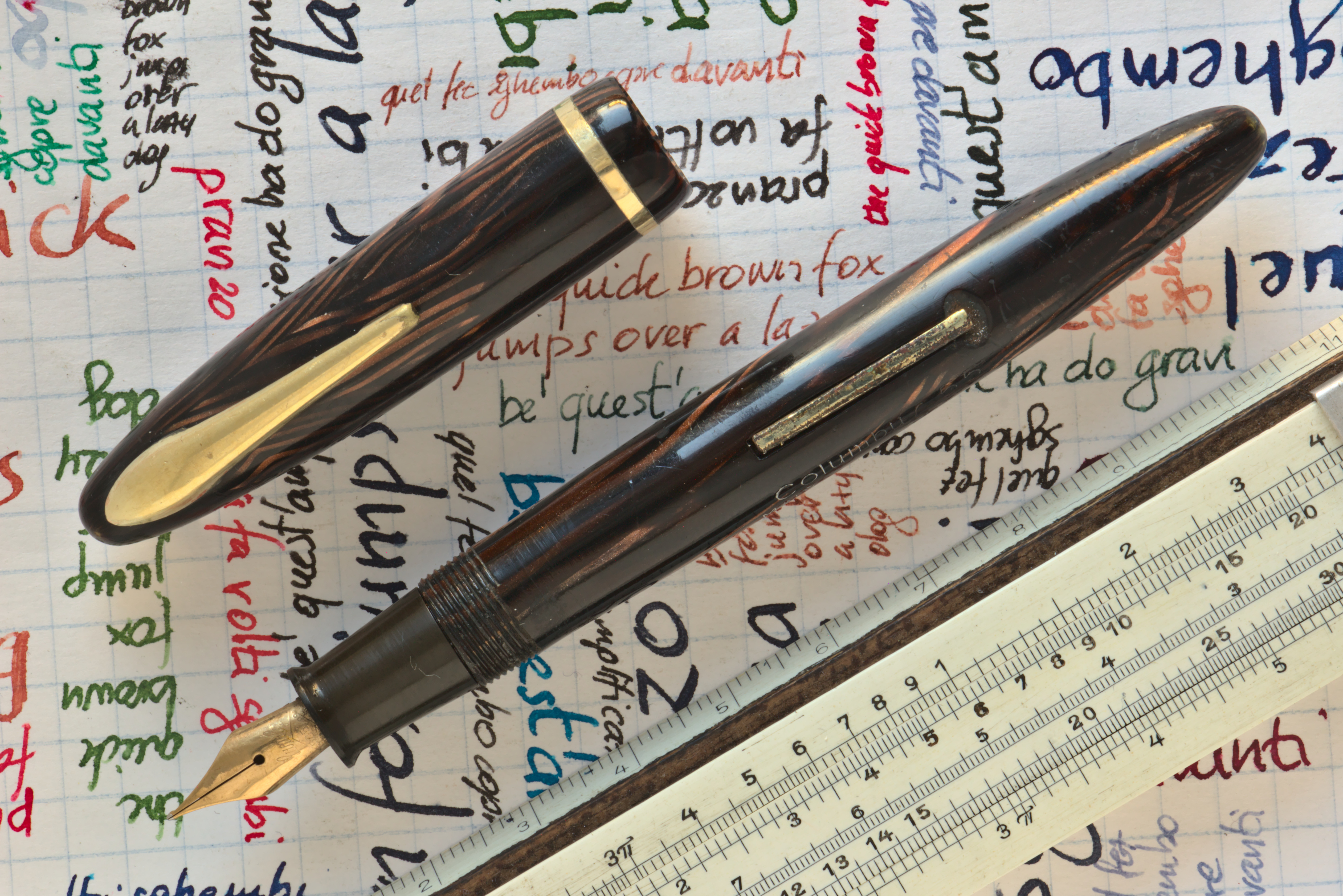 Foto di una penna Columbus. Modello: Columbus 55. Caricamento a levetta. Realizzazione in celluloide striata marrone.