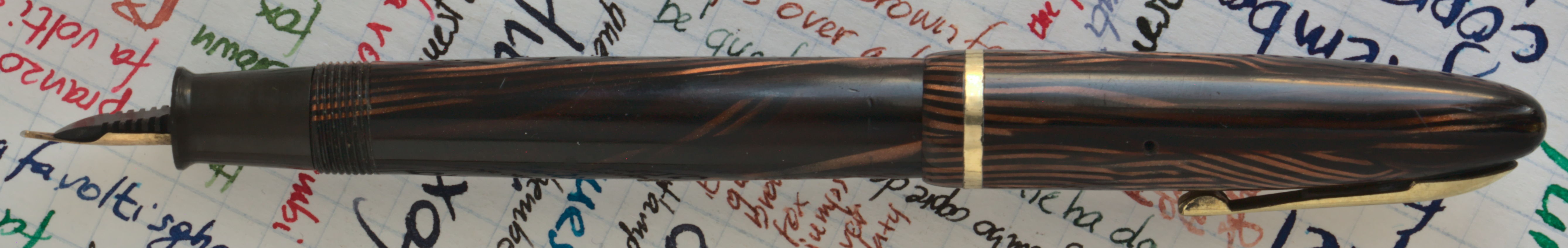 Foto di una penna Columbus. Modello: Columbus 55. Caricamento a levetta. Realizzazione in celluloide striata marrone.
