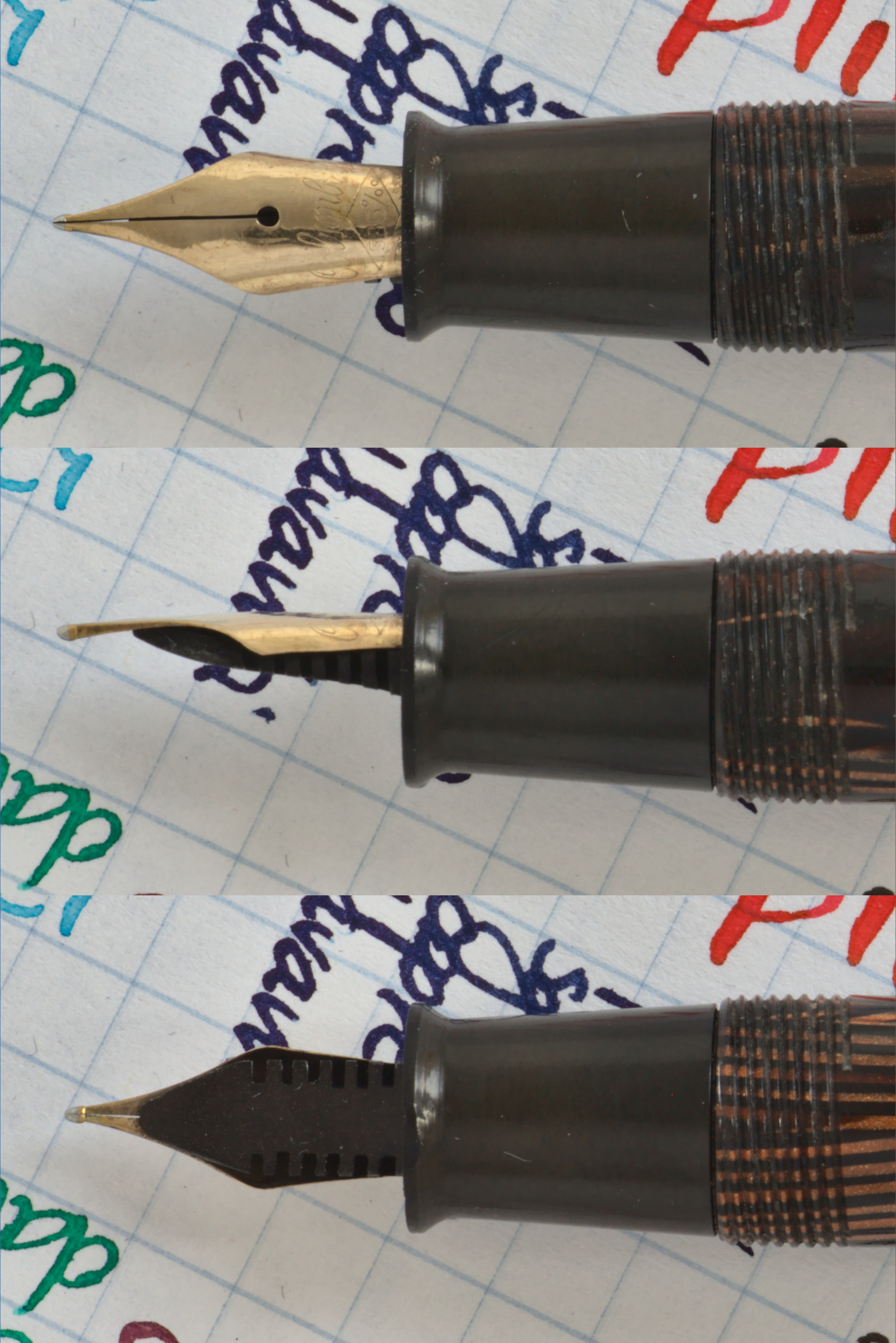 Photo of a pen produced by Columbus. Model: Columbus 55. Filling system: lever filler. In striated brown celluloid. Detail of nib. Detail of feeder.